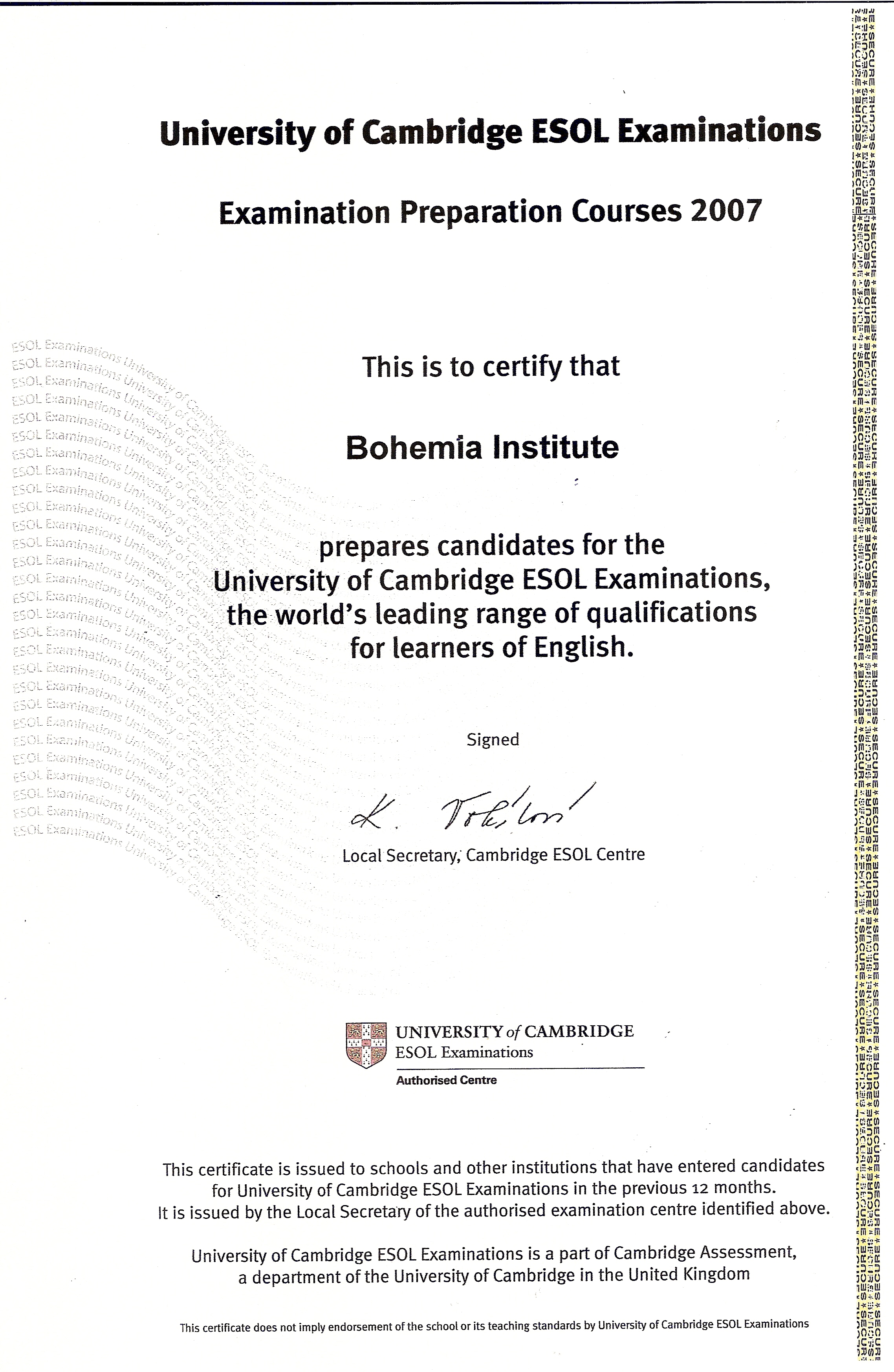 BOHEMIA INSTITUT se stal již v roce 2007 držitelem certifikátu významného partnera University of Cambridge ESOL Examinations uděleného The British Council institucím, které připravily největší počet kandidátů na Cambridgeské zkoušky (PET, FCE, CAE)