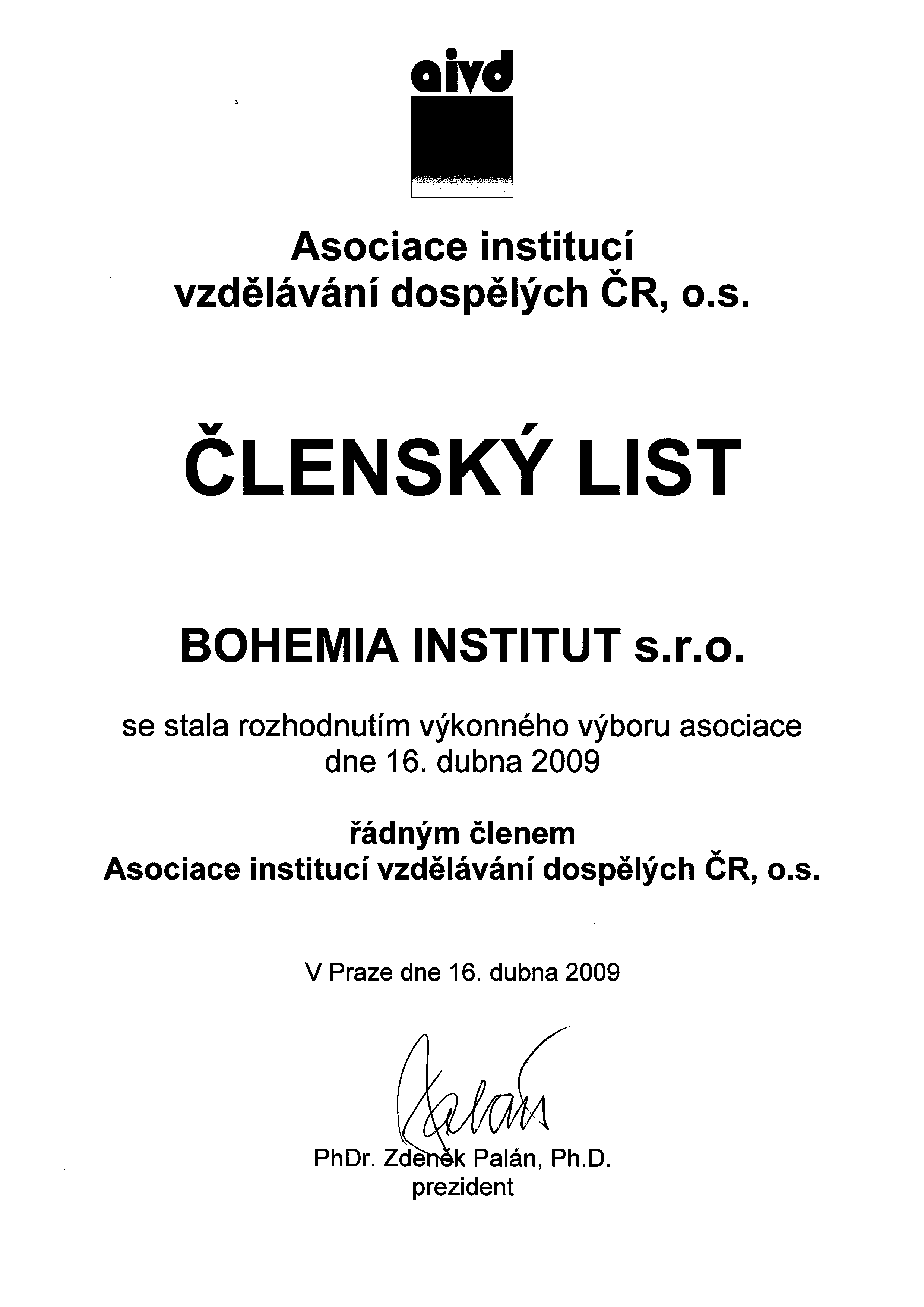 Hospodářské komory ČR, dlouholetým členem AIVD (Asociace institucí vzdělávání dospělých) a certifikovaným a zakládajícím členem AJŠ (Asociace jazykových škol ČR). Svým členstvím se zavazuje k dodržování Kodexu kvality AJŠ , Etického kodexu a Normy AJŠ při poskytování jazykového vzdělávání, AIVD desatera - kodexu kvality vzdělávací instituce a svých lektorů.