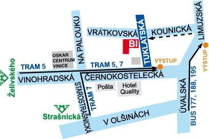 tram 16, výstupní stanice Zborov/Strašnické divadlo - bus 177, 195, 188 výstupní stanice Limuzská a dále pěšky cca 3 min přes park a ulici Kounickou k objektu institutu nebo 1 stanice tram 19, 16 směr centrum Prahy.